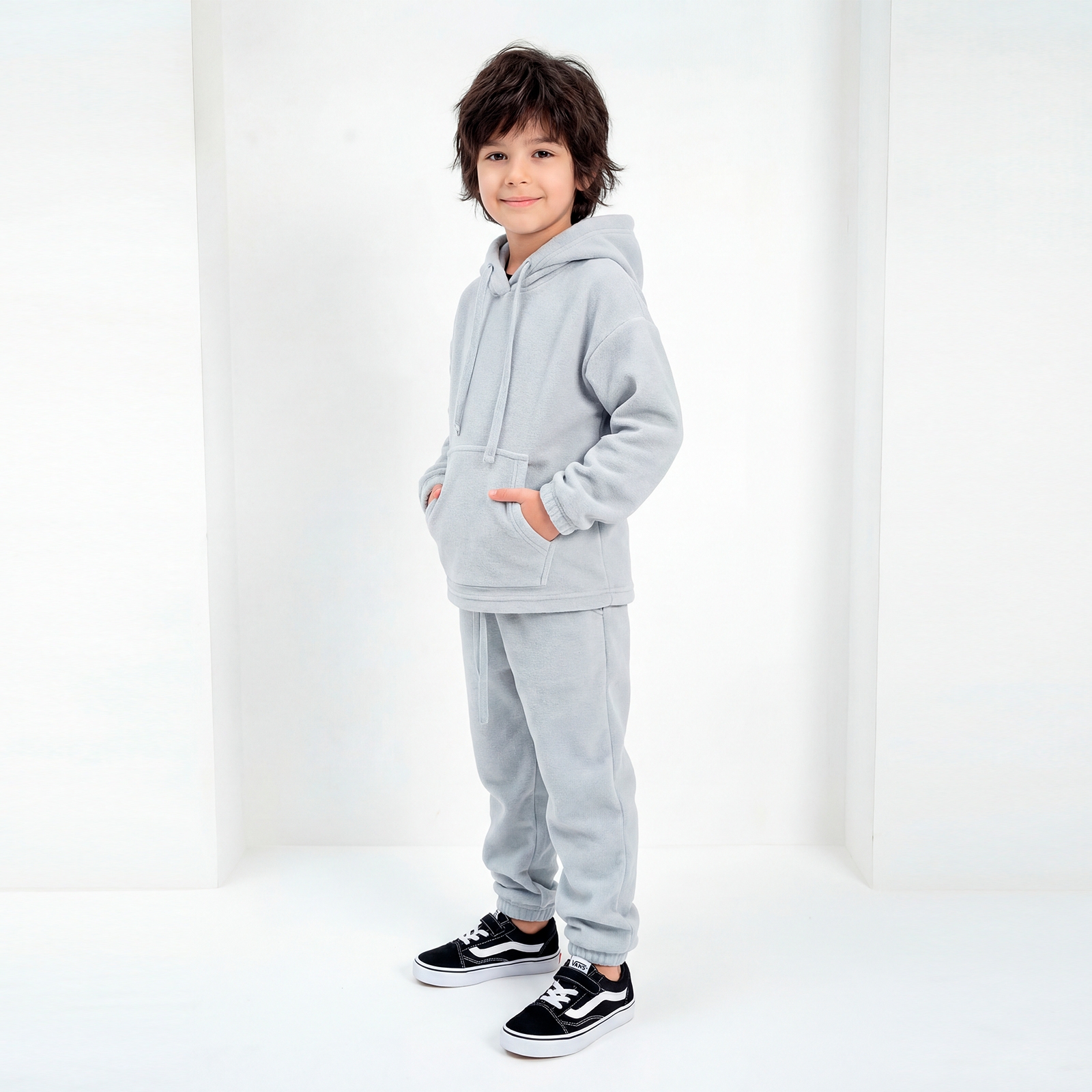 Рост модели на фото 128 см. Флисовые брюки  для мальчика и девочки  изготовлены из высококачественного и мягкого флиса. Флисовые брюки для детей идеально подходят для активных игр на свежем воздухе и уютных вечеров дома. Удобная резинка на талии гарантирует идеальную посадку, а стильный дизайн делает их универсальным элементом гардероба. Сочетаются с худи, свитшотами или футболками.